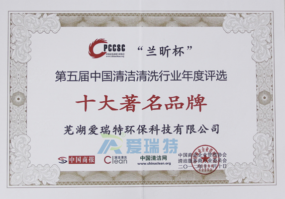 金秋颯爽,碩果累累,由中國商報、中國清潔網、中國商業企業管理協會、清潔服務商專業委員會舉行的“蘭昕懷”第五屆中國清潔清洗行業年度評選活動中,蕪湖愛瑞特環??萍加邢薰颈辉u為“十大著名品.